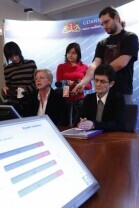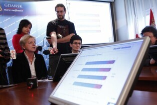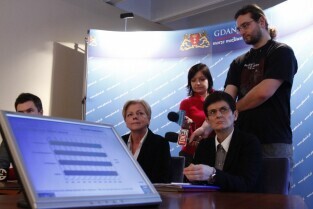 Gdańsk, Urząd Miejski. Konferencja prasowa, podczas której zaprezentowany został raport opracowany przez pracownię PBS DGA pt. "Ocena jakości pracy oraz obsługi klientów UM w Gdańsku". Nz. od lewej: Tomasz Filipowicz (Wydział Obsługi Mieszkańców), Sekretarz Miasta Danuta Janczarek, Dyrektor Wydziału Obsługi Mieszkańców Izabela Dulkiewicz