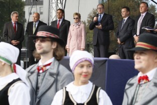 Gdańsk, Targ Węglowy. Jarmark Wileński - prezentacja muzyki i wyrobów litewskich, odbywający się w ramach festiwalu "Wilno w Gdańsku". Nz. od lewej: Przewodniczący Rady Miasta Gdańska Bogdan Oleszek, Wicemarszałek Woj. Pomorskiego Wiesław Byczkowski, Konsul Honorowy Litwy w Gdańsku Józef Poltrok, Ambasador Litwy w Polsce Loreta Zakareviciene, Prezydent Gdańska Paweł Adamowicz, Wicemer Wilna Jaroslav Kaminski, Dyrektor Administracyjny Wilna Valdas Klimantavicius