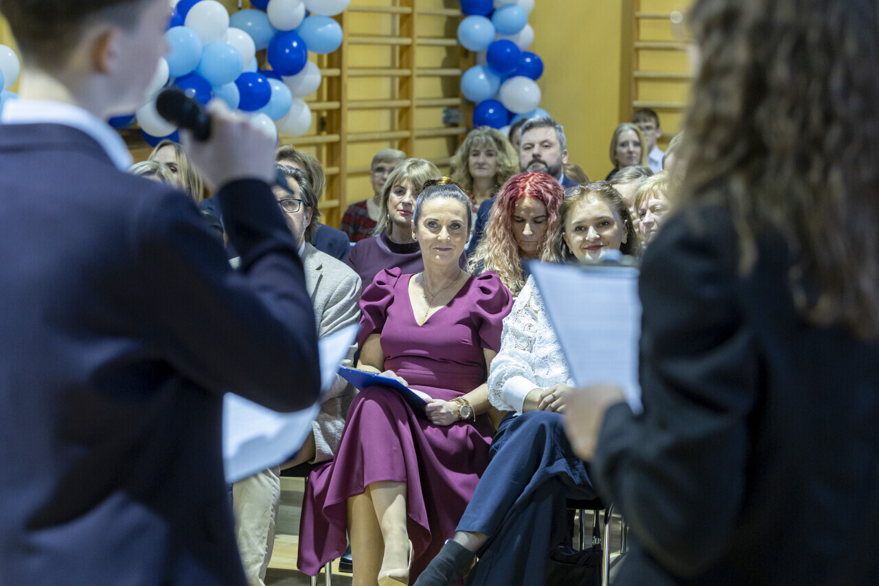 Gdańsk. Z-ca Prezydenta ds. mobilności i bezpieczeństwa, radni Andrzej Kowalczys, Piotr Dzik i Piotr Gierszewski oraz liczni goście zebrali się na sali gimnastycznej Szkoły Podstawowej nr 14 by świętować 70-lecie tej placówki. Nz. Dyrektor szkoły - Ilona Orzechowska