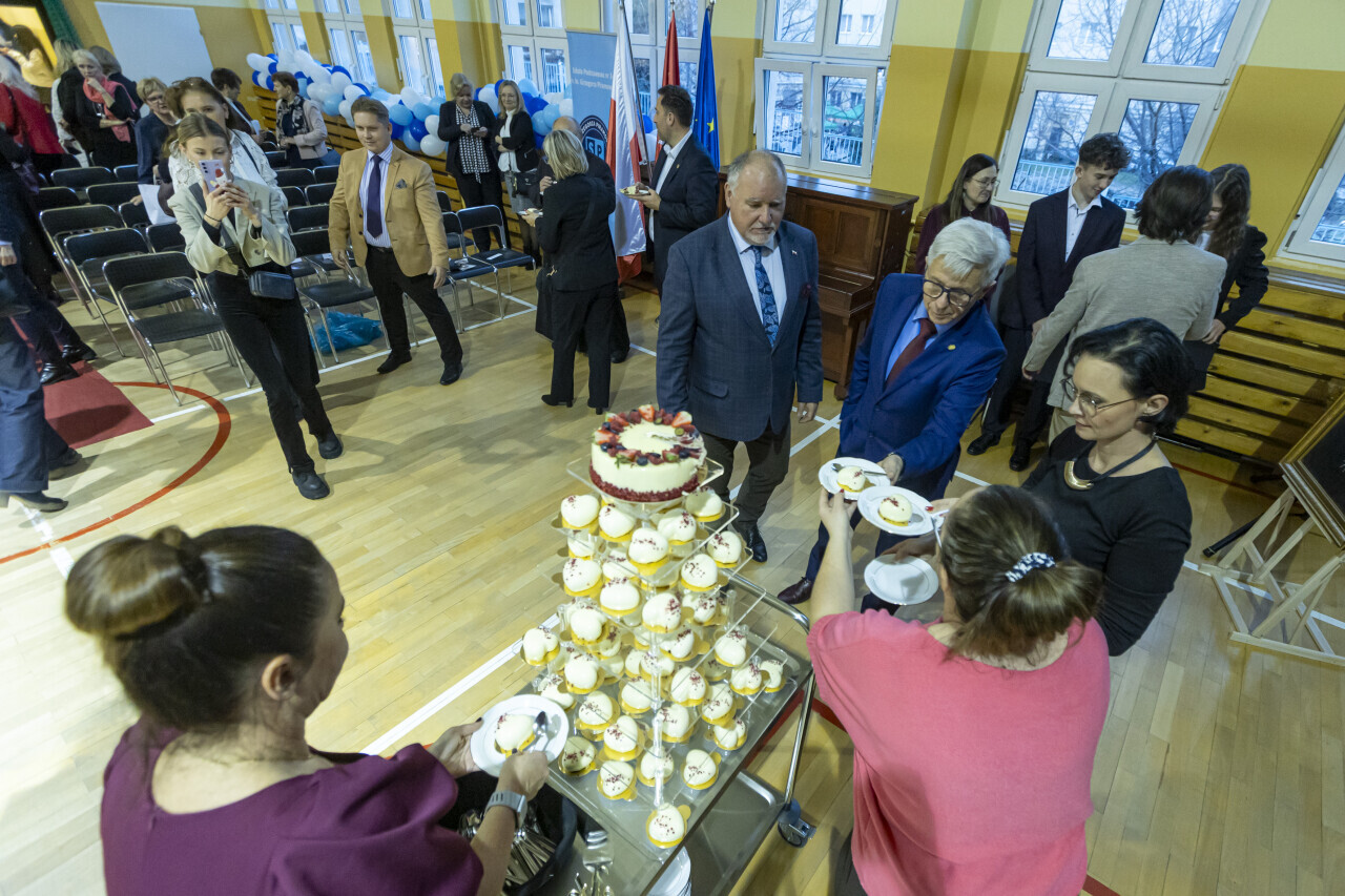 Gdańsk. Z-ca Prezydenta ds. mobilności i bezpieczeństwa, radni Andrzej Kowalczys, Piotr Dzik i Piotr Gierszewski oraz liczni goście zebrali się na sali gimnastycznej Szkoły Podstawowej nr 14 by świętować 70-lecie tej placówki