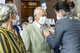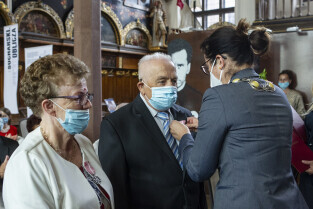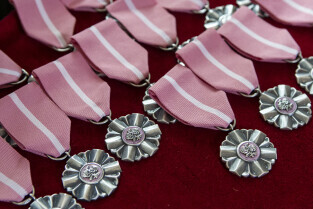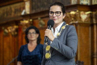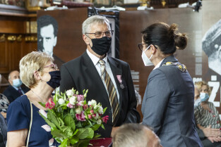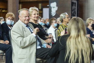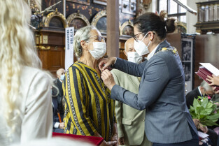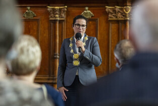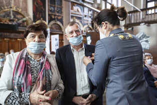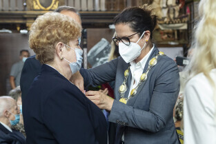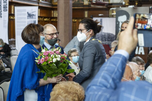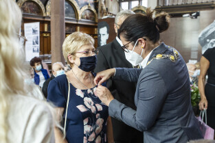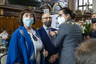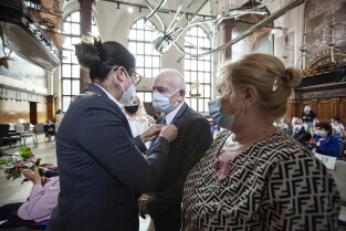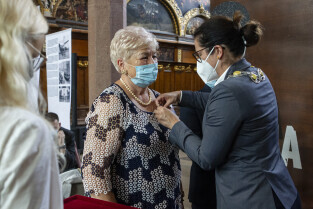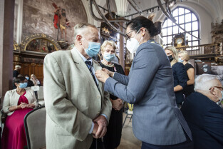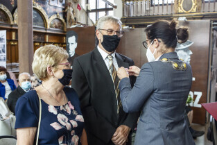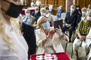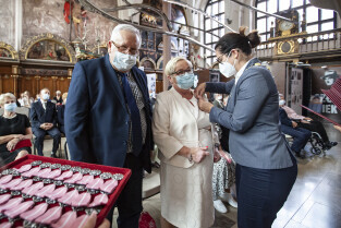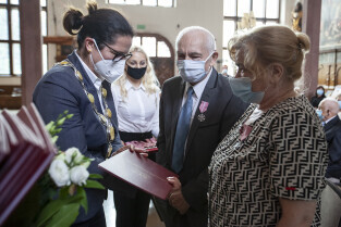 Dwór Artusa w Gdańsku. Prezydent Gdańska Aleksandra Dulkiewicz wręcza pamiątkowe odznaczenia za długoletnie pożycie małżeńskie
