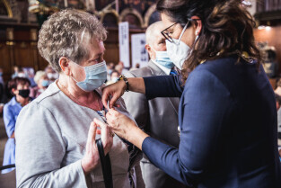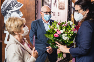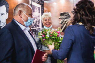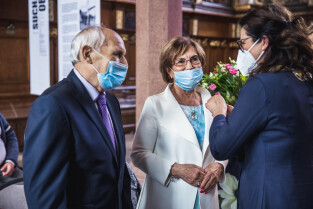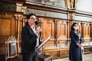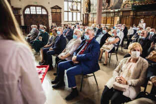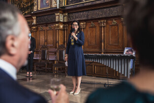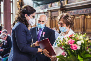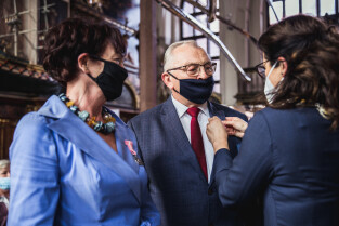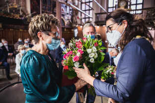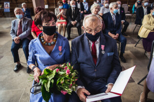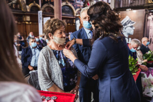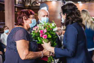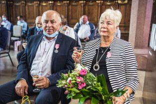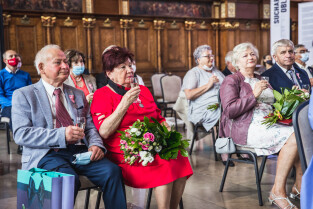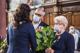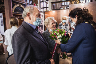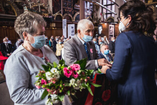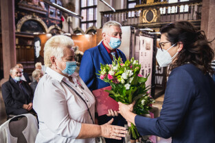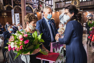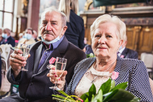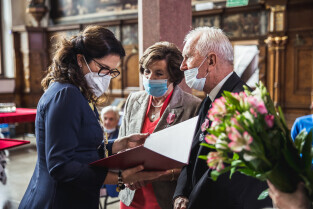 Dwór Artusa w Gdańsku. Prezydent Gdańska Aleksandra Dulkiewicz wręcza pamiątkowe odznaczenia za długoletnie pożycie małżeńskie