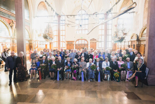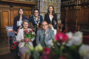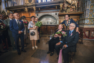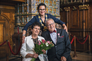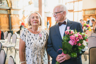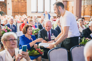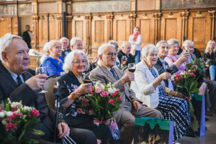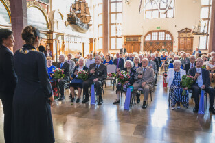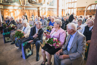 Gdańsk, Dwór Artusa. Jubileusz Par Małżeńskich - Złote Gody, podczas których Prezydent Gdańska Aleksandra Dulkiewicz wręczyła medale za długoletnie pożycie małżeńskie.