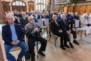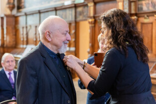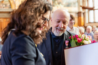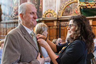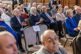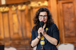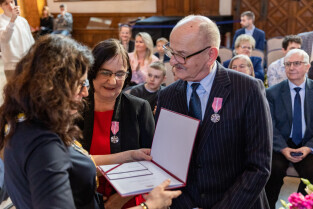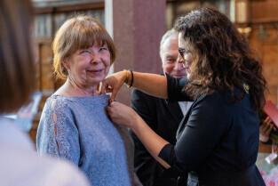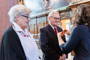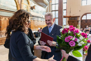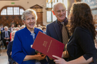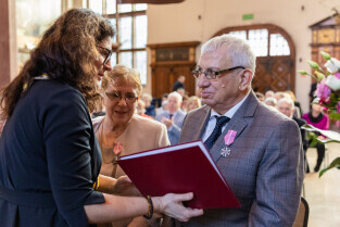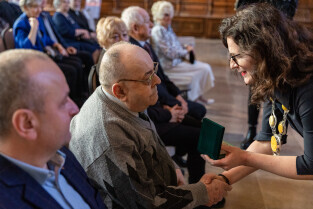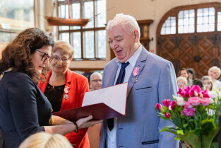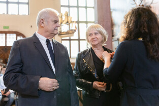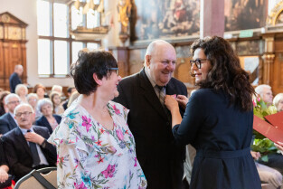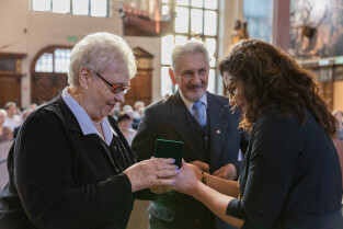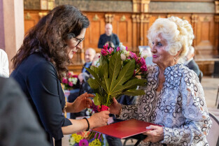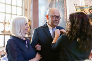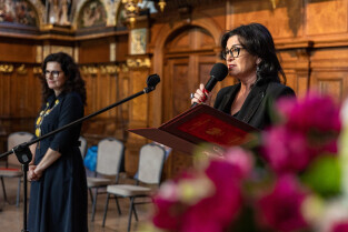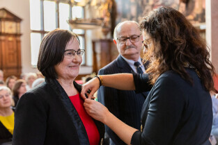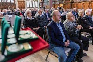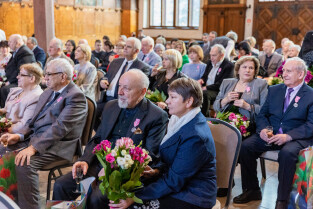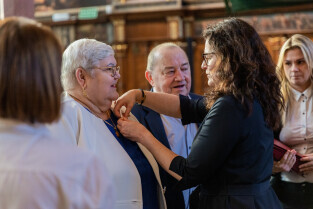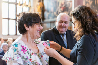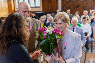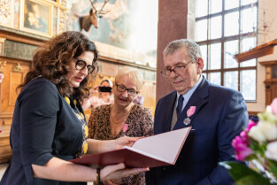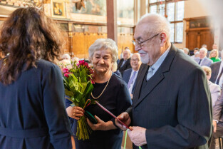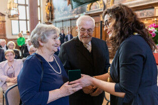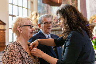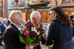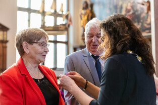 Gdańsk. Dwór Artusa. Jubileusz Par Małżeńskich - Złote Gody, podczas których Prezydent Gdańska Aleksandra Dulkiewicz wręczyła medale za długoletnie pożycie małżeńskie