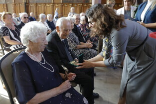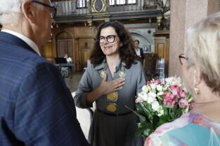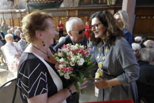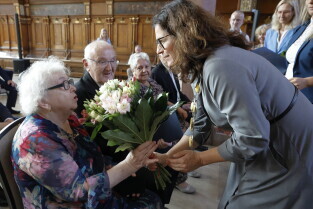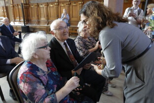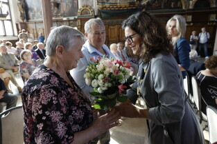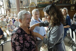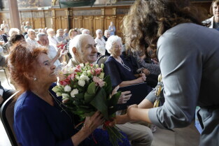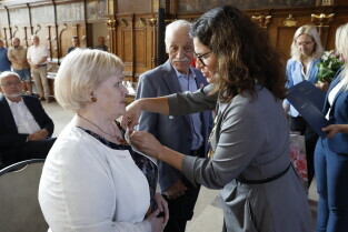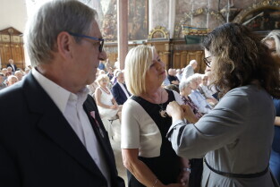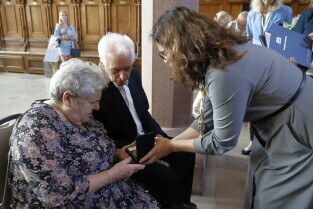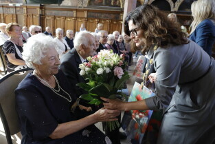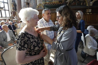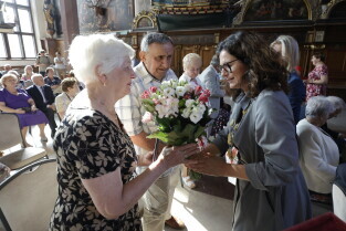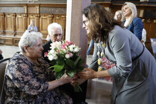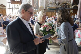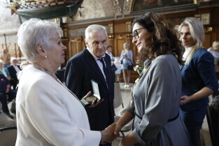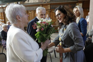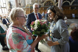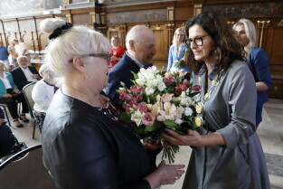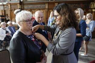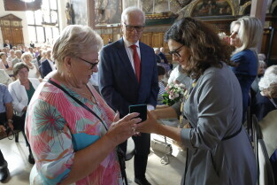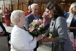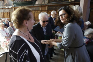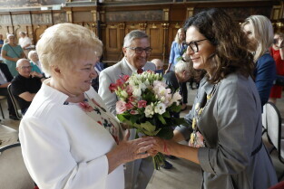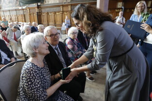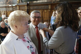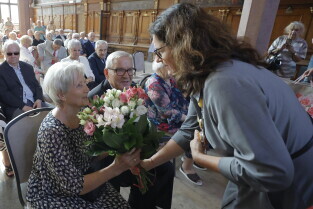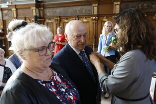 Gdańsk. Jubileusz Par Małżeńskich - Złote Gody, podczas których Prezydent Gdańska Aleksandra Dulkiewicz wręczyła medale za długoletnie pożycie małżeńskie.