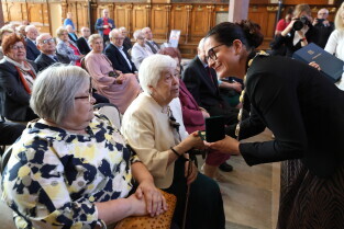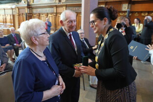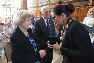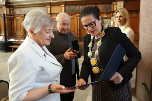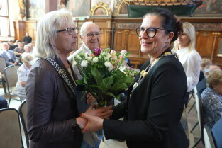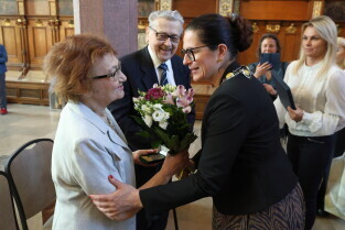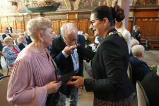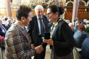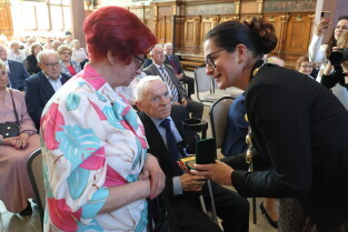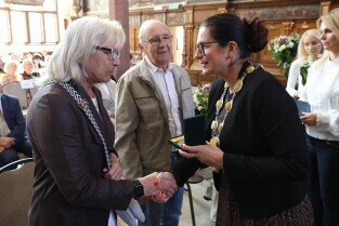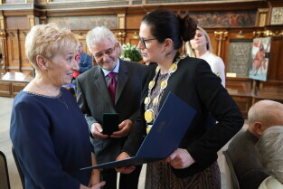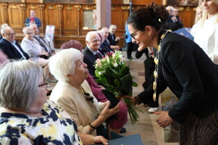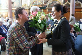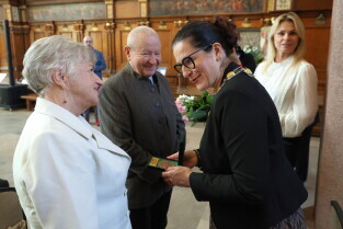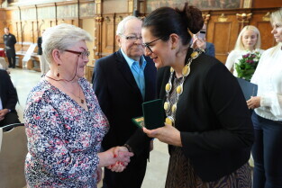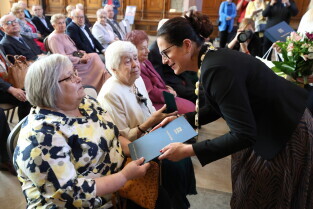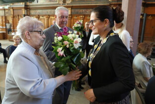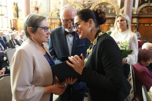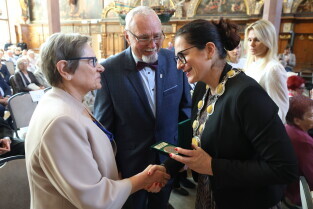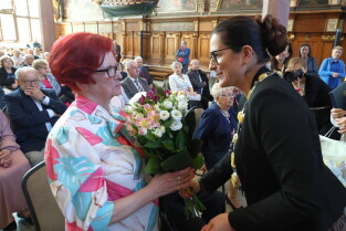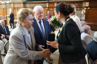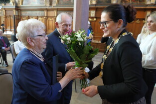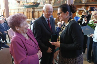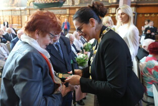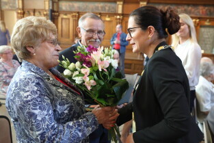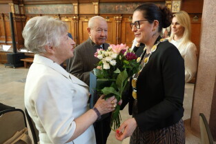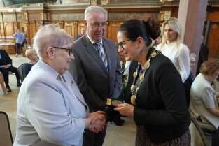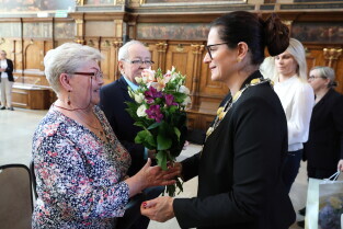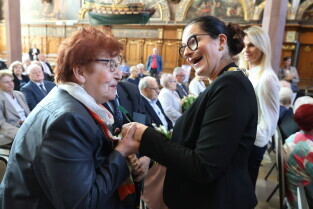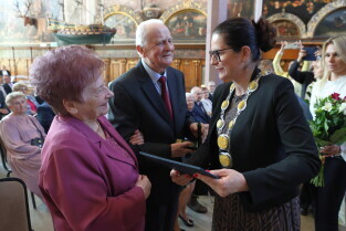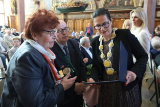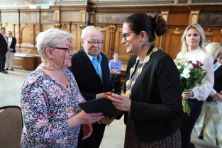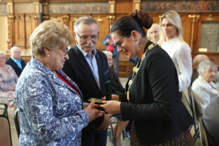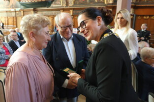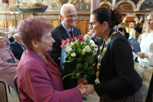 Gdańsk. Ratusz Głównego Miasta. Jubileusz Par Małżeńskich - Złote Gody, podczas których Prezydent Gdańska Aleksandra Dulkiewicz wręczyła medale za długoletnie pożycie małżeńskie.