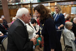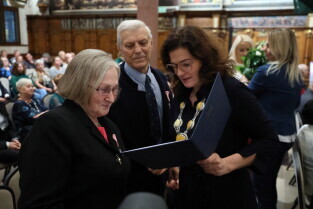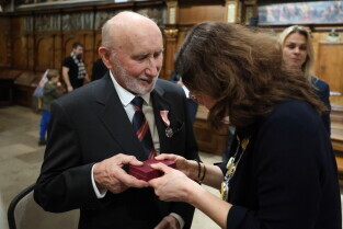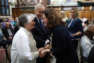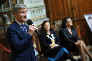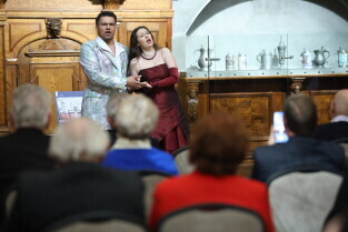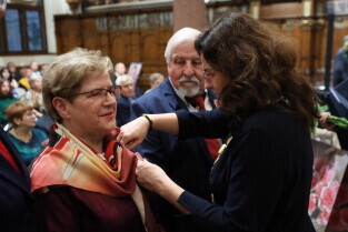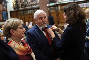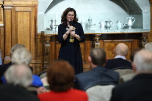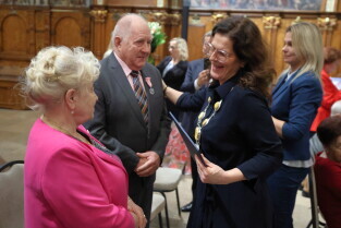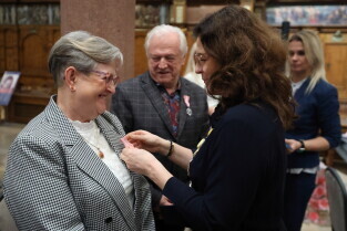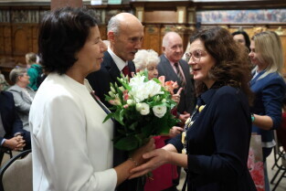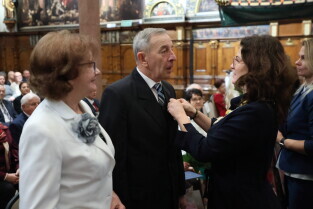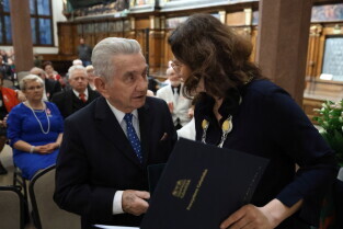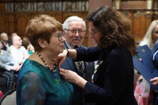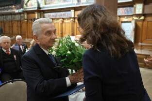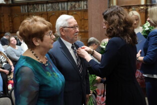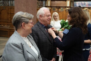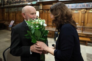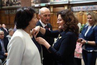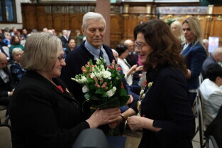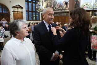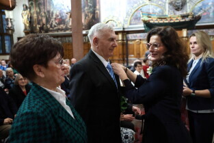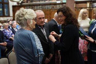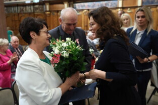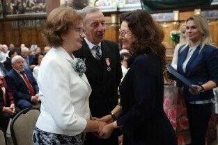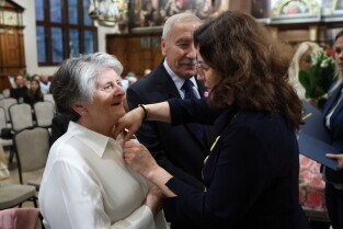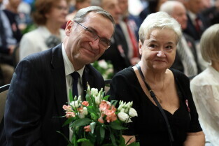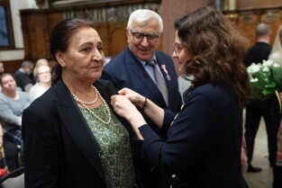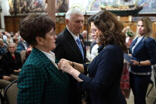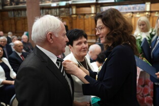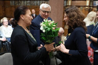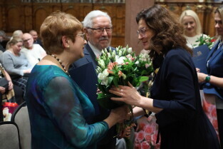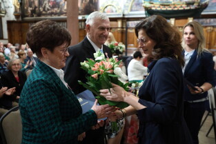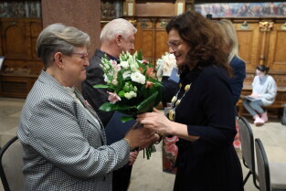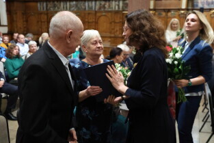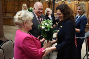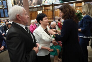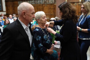 Gdańsk. Dwór Artusa. Jubileusz Par Małżeńskich - Złote Gody, podczas których Prezydent Gdańska Aleksandra Dulkiewicz wręczyła medale za długoletnie pożycie małżeńskie.