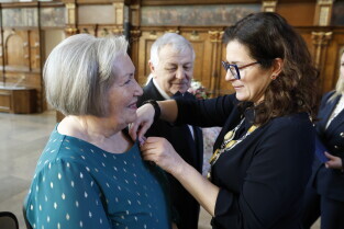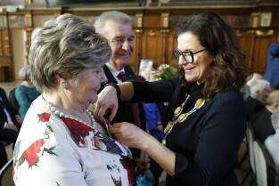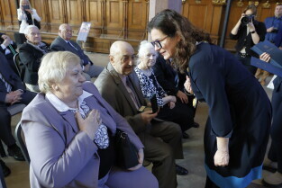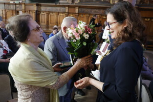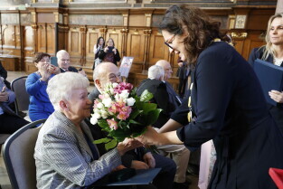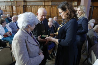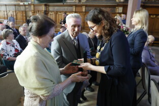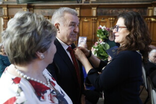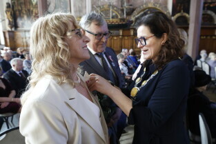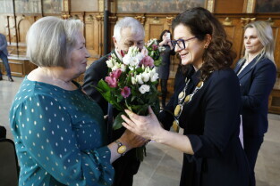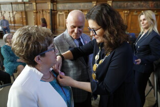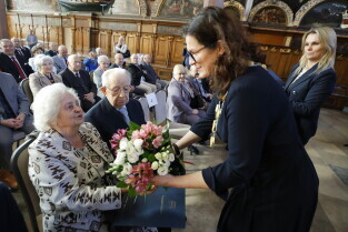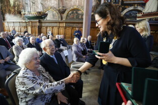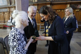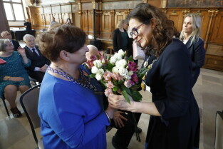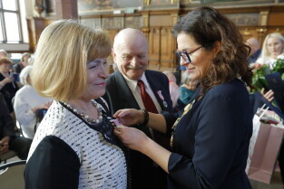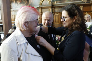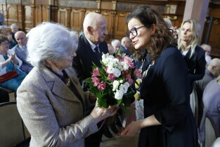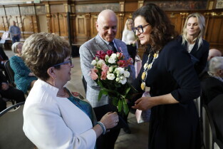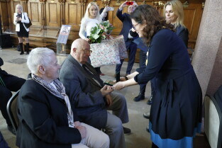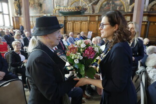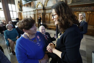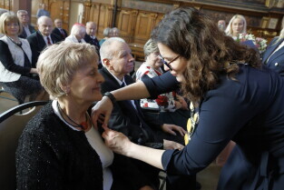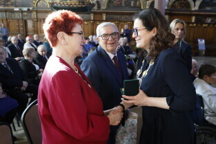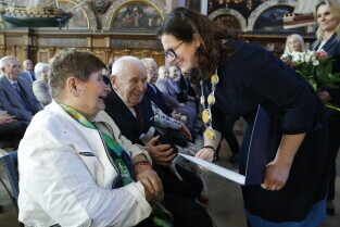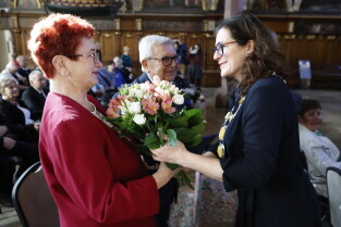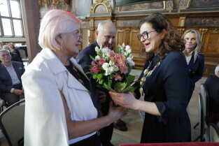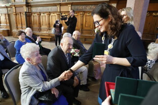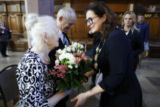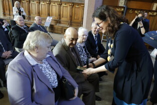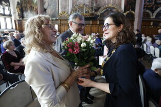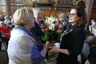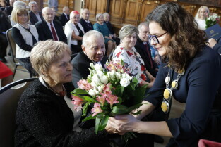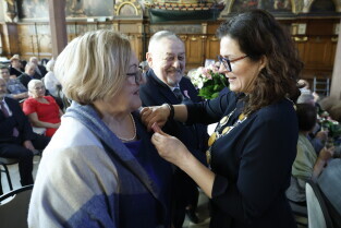 Gdańsk. Dwór Artusa. Jubileusz Par Małżeńskich - Złote Gody, podczas których Prezydent Gdańska Aleksandra Dulkiewicz wręczyła medale za długoletnie pożycie małżeńskie.