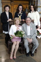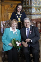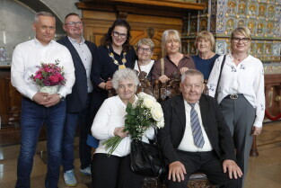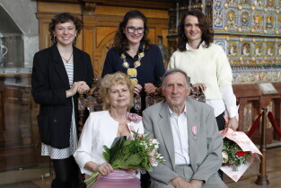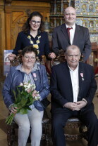 Gdańsk.Dwór Artusa. Jubileusz Par Małżeńskich - Złote Gody, podczas których Prezydent Gdańska Aleksandra Dulkiewicz wręczyła medale za długoletnie pożycie małżeńskie.