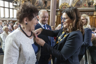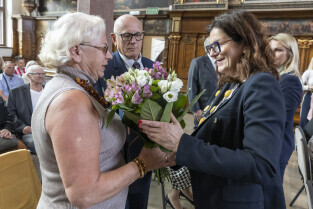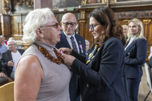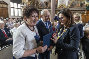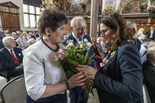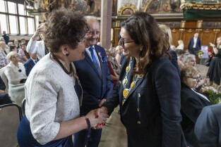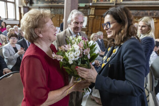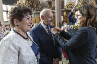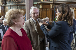 Gdańsk.Dwór Artusa. Jubileusz Par Małżeńskich - Złote Gody, podczas których Prezydent Gdańska Aleksandra Dulkiewicz wręczyła medale za długoletnie pożycie małżeńskie.