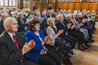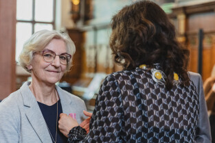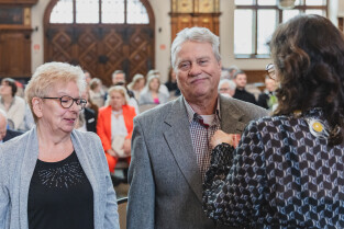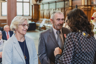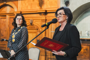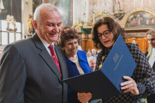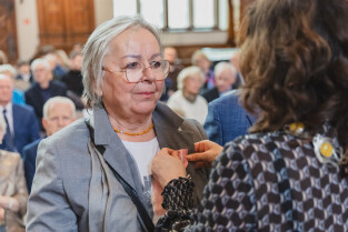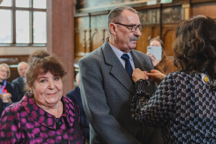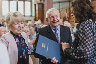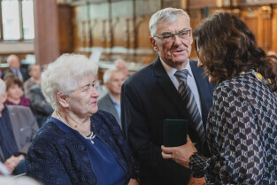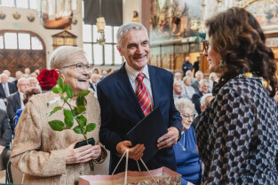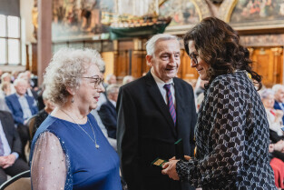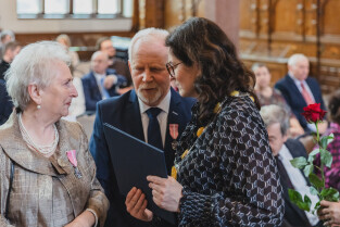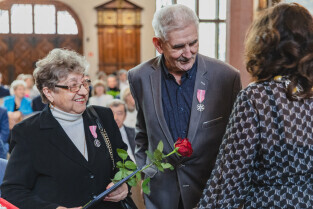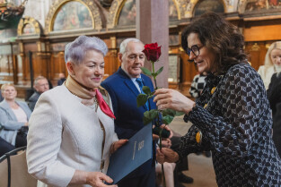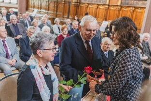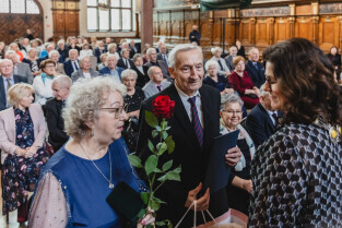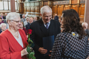Gdańsk. Dwór Artusa. Jubileusz Par Małżeńskich - Złote Gody, podczas których Prezydent Gdańska Aleksandra Dulkiewicz wręczyła medale za długoletnie pożycie małżeńskie
