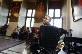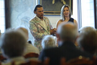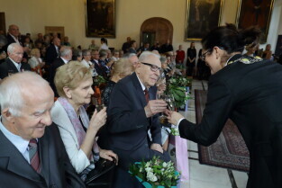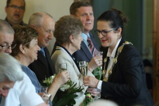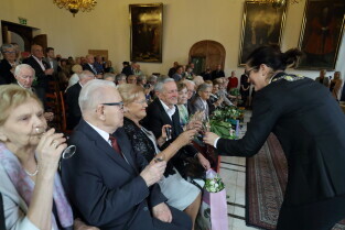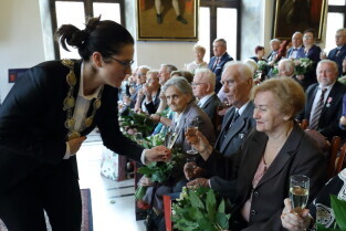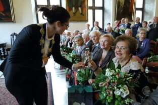 Gdańsk, Ratusz Głównego Miasta. Jubileusz Par Małżeńskich - Złote Gody, podczas których Prezydent Gdańska Aleksandra Dulkiewicz wręczyła medale za długoletnie pożycie małżeńskie.