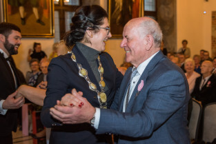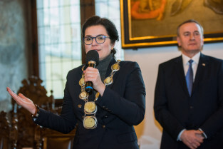 Gdańsk, Ratusz Głównego Miasta. Jubileusz Par Małżeńskich - Złote Gody, podczas których Prezydent Gdańska Aleksandra Dulkiewicz wręczyła medale za długoletnie pożycie małżeńskie. Nz. Prezydent Gdańska Aleksandra Dulkiewicz