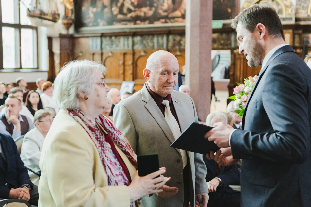 Gdańsk. Dwór Artusa. Jubileusz Par Małżeńskich - Złote Gody, podczas których w imieniu Prezydent Gdańska Aleksandry Dulkiewicz, wiceprezydent Piotr Grzelak wręczył medale za długoletnie pożycie małżeńskie.