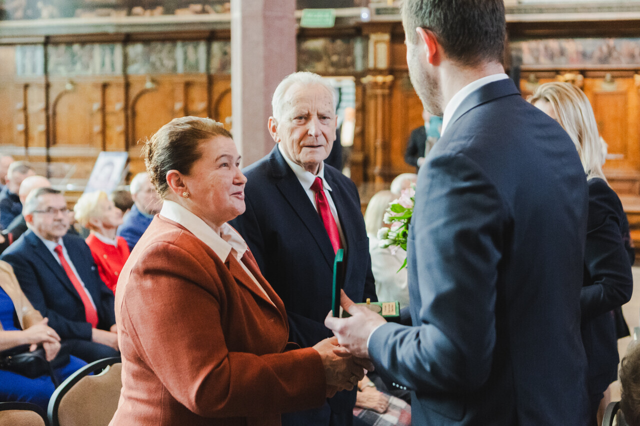 Gdańsk. Dwór Artusa. Jubileusz Par Małżeńskich - Złote Gody, podczas których w imieniu Prezydent Gdańska Aleksandry Dulkiewicz, wiceprezydent Piotr Grzelak wręczył medale za długoletnie pożycie małżeńskie.