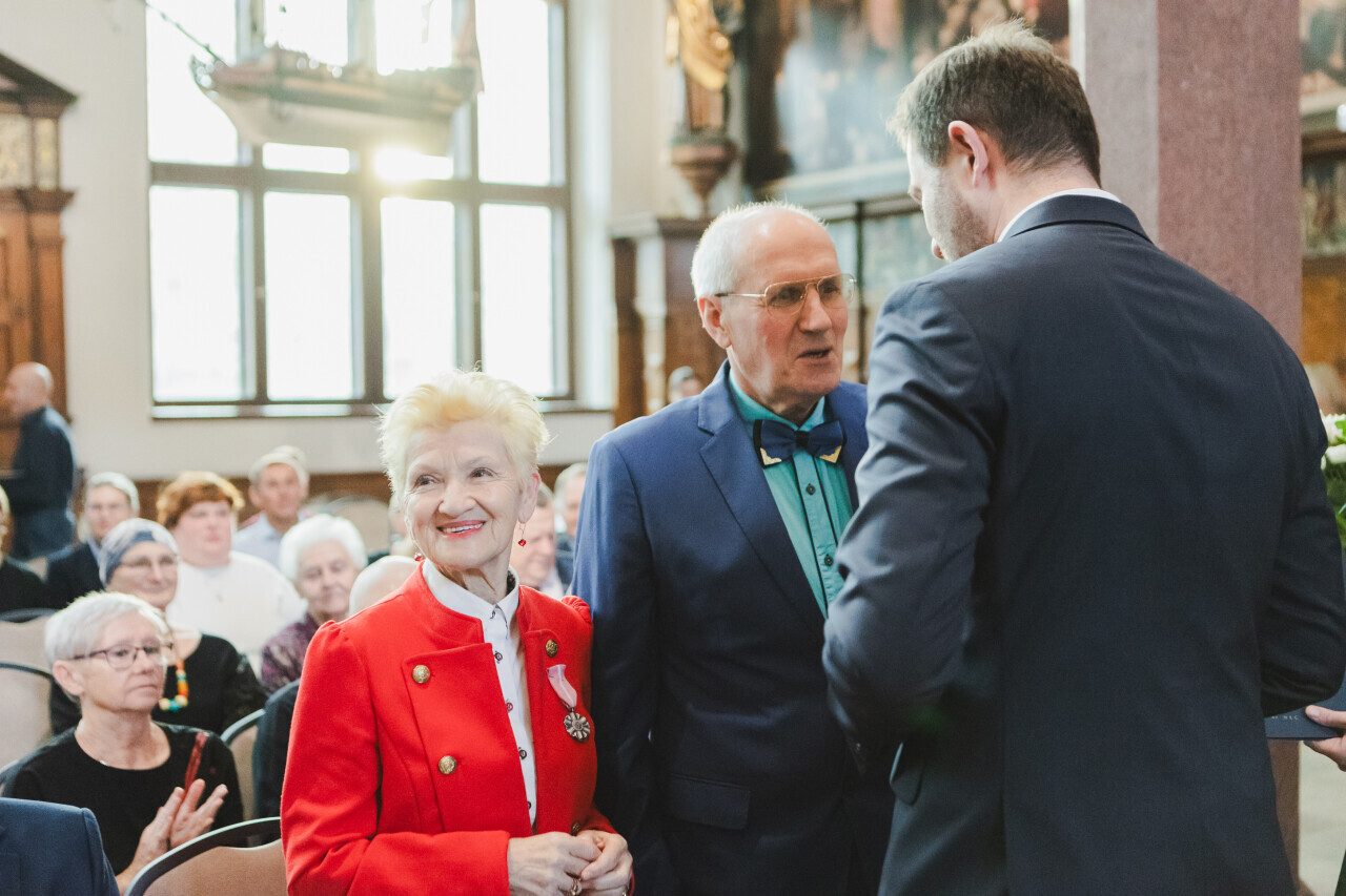 Gdańsk. Dwór Artusa. Jubileusz Par Małżeńskich - Złote Gody, podczas których w imieniu Prezydent Gdańska Aleksandry Dulkiewicz, wiceprezydent Piotr Grzelak wręczył medale za długoletnie pożycie małżeńskie.