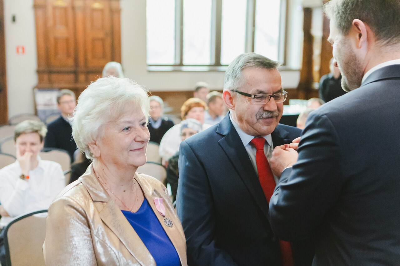 Gdańsk. Dwór Artusa. Jubileusz Par Małżeńskich - Złote Gody, podczas których w imieniu Prezydent Gdańska Aleksandry Dulkiewicz, wiceprezydent Piotr Grzelak wręczył medale za długoletnie pożycie małżeńskie.