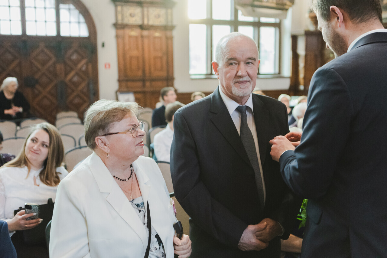 Gdańsk. Dwór Artusa. Jubileusz Par Małżeńskich - Złote Gody, podczas których w imieniu Prezydent Gdańska Aleksandry Dulkiewicz, wiceprezydent Piotr Grzelak wręczył medale za długoletnie pożycie małżeńskie.