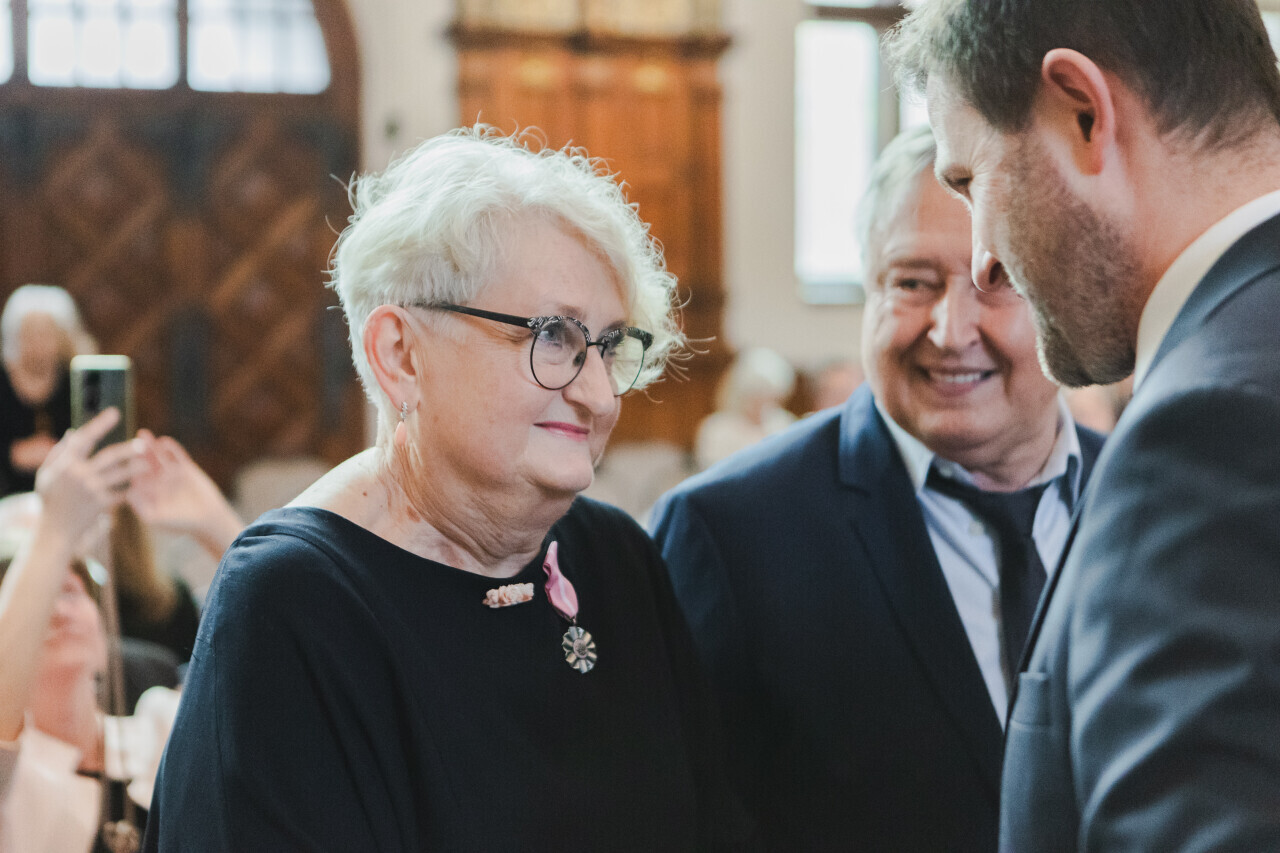 Gdańsk. Dwór Artusa. Jubileusz Par Małżeńskich - Złote Gody, podczas których w imieniu Prezydent Gdańska Aleksandry Dulkiewicz, wiceprezydent Piotr Grzelak wręczył medale za długoletnie pożycie małżeńskie.