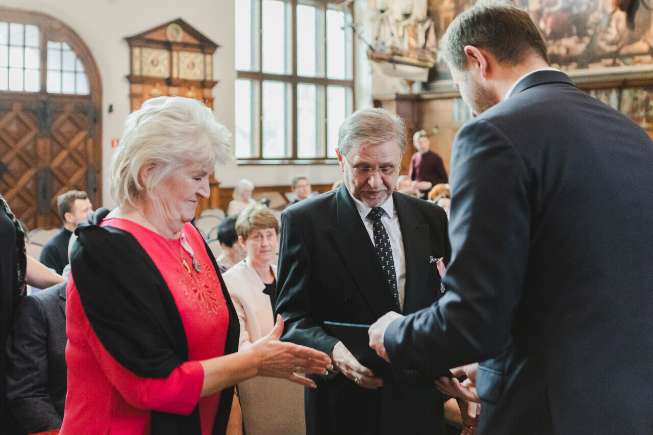 Gdańsk. Dwór Artusa. Jubileusz Par Małżeńskich - Złote Gody, podczas których w imieniu Prezydent Gdańska Aleksandry Dulkiewicz, wiceprezydent Piotr Grzelak wręczył medale za długoletnie pożycie małżeńskie.
