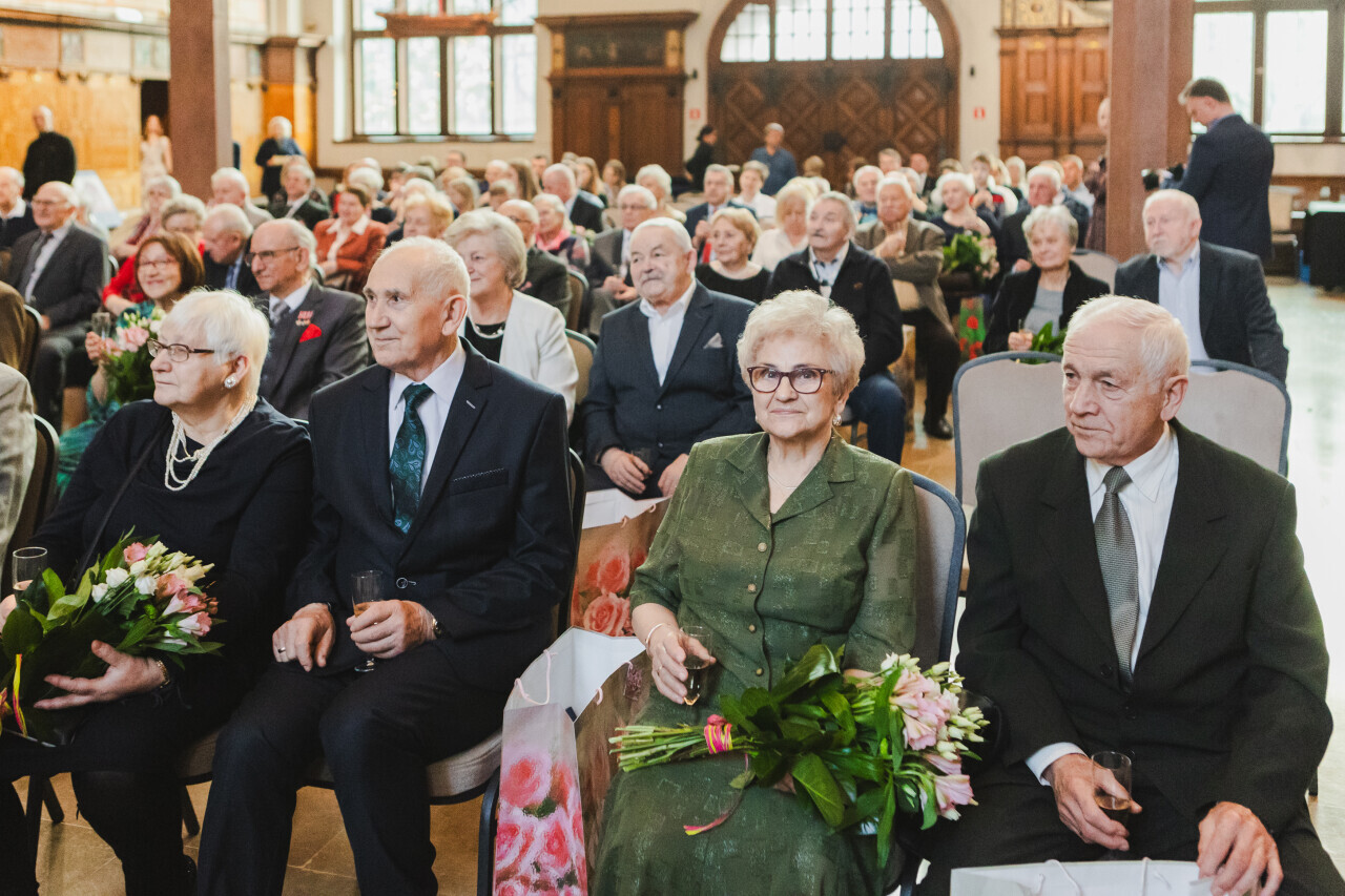 Gdańsk. Dwór Artusa. Jubileusz Par Małżeńskich - Złote Gody, podczas których w imieniu Prezydent Gdańska Aleksandry Dulkiewicz, wiceprezydent Piotr Grzelak wręczył medale za długoletnie pożycie małżeńskie.