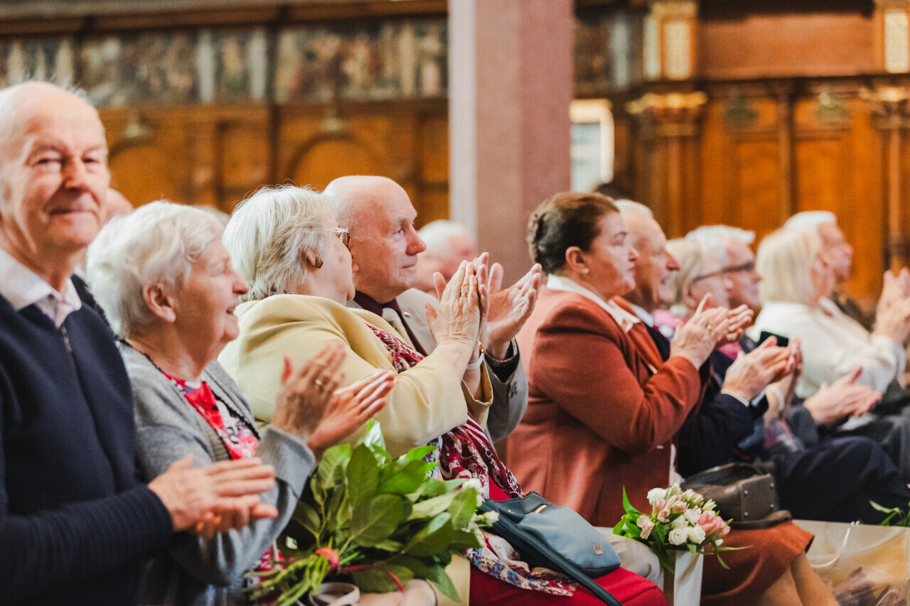 Gdańsk. Dwór Artusa. Jubileusz Par Małżeńskich - Złote Gody, podczas których w imieniu Prezydent Gdańska Aleksandry Dulkiewicz, wiceprezydent Piotr Grzelak wręczył medale za długoletnie pożycie małżeńskie.