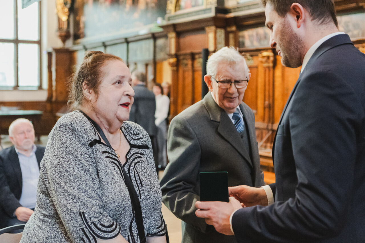 Gdańsk. Dwór Artusa. Jubileusz Par Małżeńskich - Złote Gody, podczas których w imieniu Prezydent Gdańska Aleksandry Dulkiewicz, wiceprezydent Piotr Grzelak wręczył medale za długoletnie pożycie małżeńskie.
