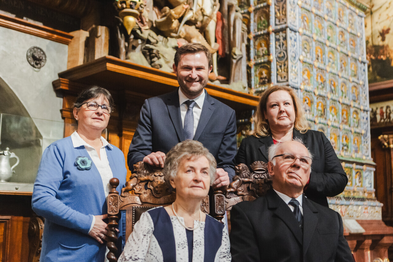 Gdańsk. Dwór Artusa. Jubileusz Par Małżeńskich - Złote Gody, podczas których w imieniu Prezydent Gdańska Aleksandry Dulkiewicz, wiceprezydent Piotr Grzelak wręczył medale za długoletnie pożycie małżeńskie.