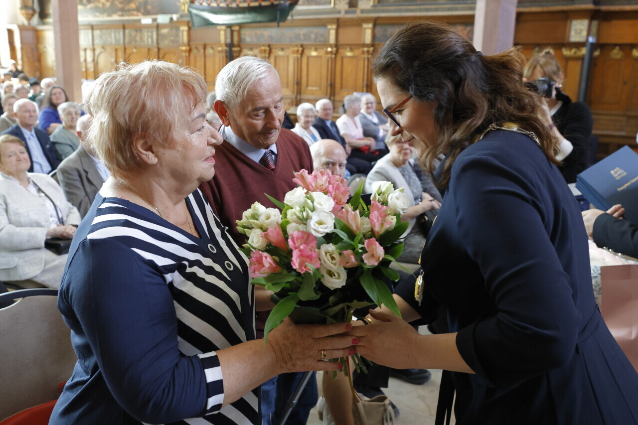 Gdańsk.Dwór Artusa. Jubileusz Par Małżeńskich - Złote Gody, podczas których Prezydent Gdańska Aleksandra Dulkiewicz wręczyła medale za długoletnie pożycie małżeńskie.