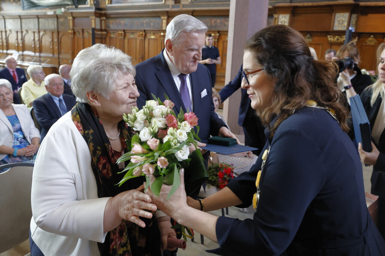 Gdańsk.Dwór Artusa. Jubileusz Par Małżeńskich - Złote Gody, podczas których Prezydent Gdańska Aleksandra Dulkiewicz wręczyła medale za długoletnie pożycie małżeńskie.
