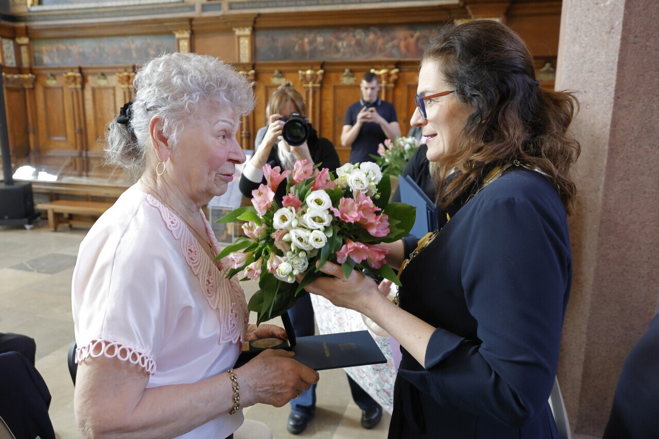 Gdańsk.Dwór Artusa. Jubileusz Par Małżeńskich - Złote Gody, podczas których Prezydent Gdańska Aleksandra Dulkiewicz wręczyła medale za długoletnie pożycie małżeńskie.