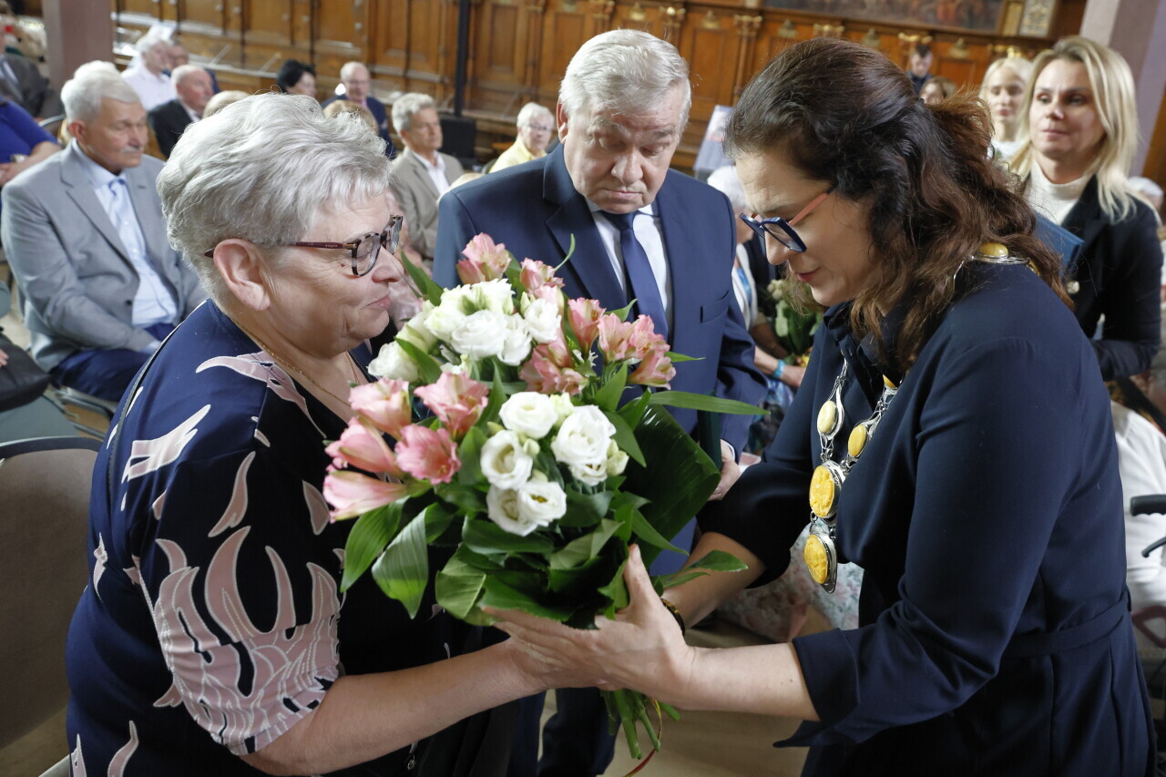 Gdańsk.Dwór Artusa. Jubileusz Par Małżeńskich - Złote Gody, podczas których Prezydent Gdańska Aleksandra Dulkiewicz wręczyła medale za długoletnie pożycie małżeńskie.