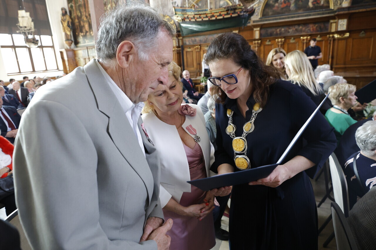 Gdańsk.Dwór Artusa. Jubileusz Par Małżeńskich - Złote Gody, podczas których Prezydent Gdańska Aleksandra Dulkiewicz wręczyła medale za długoletnie pożycie małżeńskie.