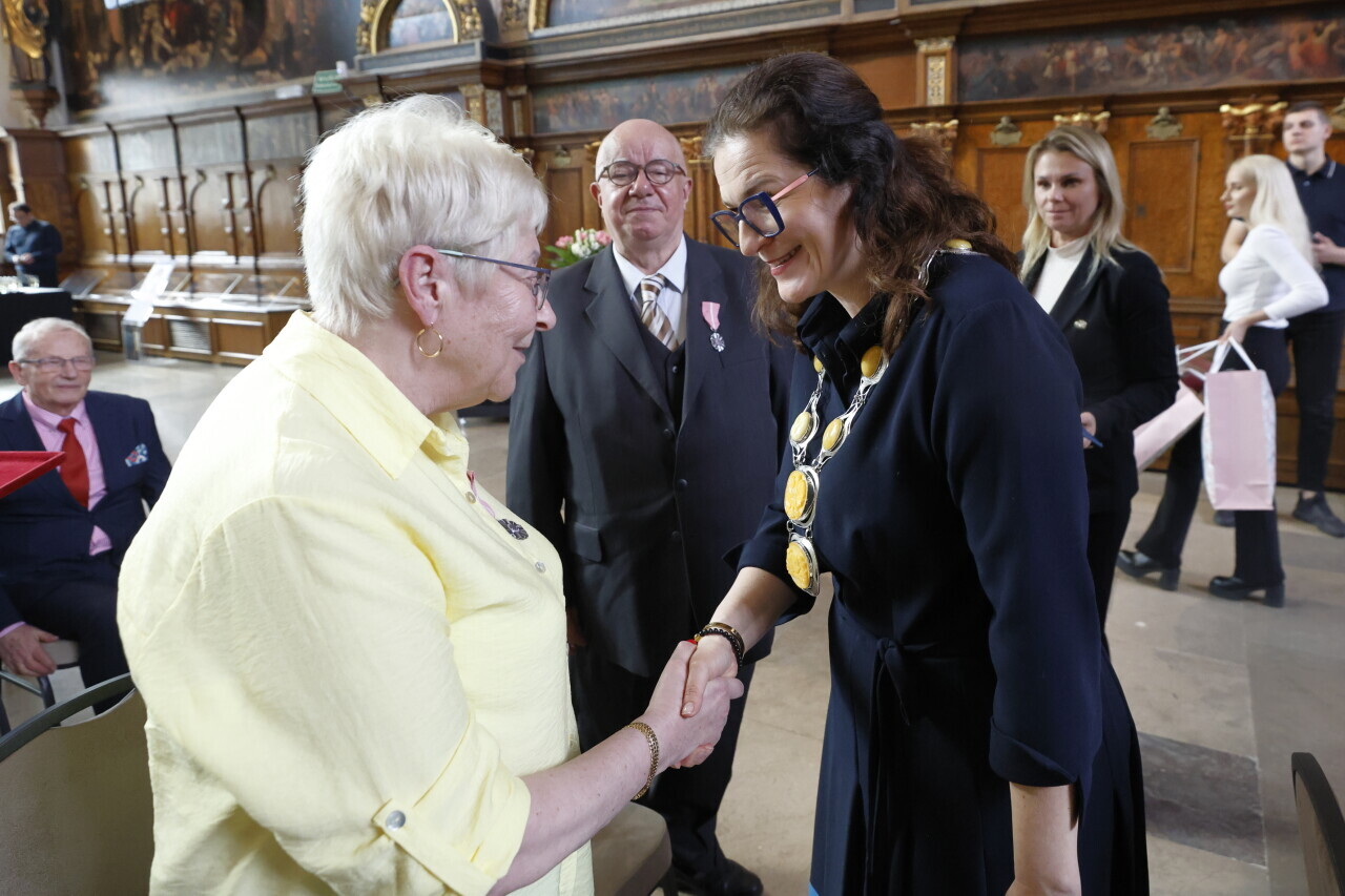 Gdańsk.Dwór Artusa. Jubileusz Par Małżeńskich - Złote Gody, podczas których Prezydent Gdańska Aleksandra Dulkiewicz wręczyła medale za długoletnie pożycie małżeńskie.