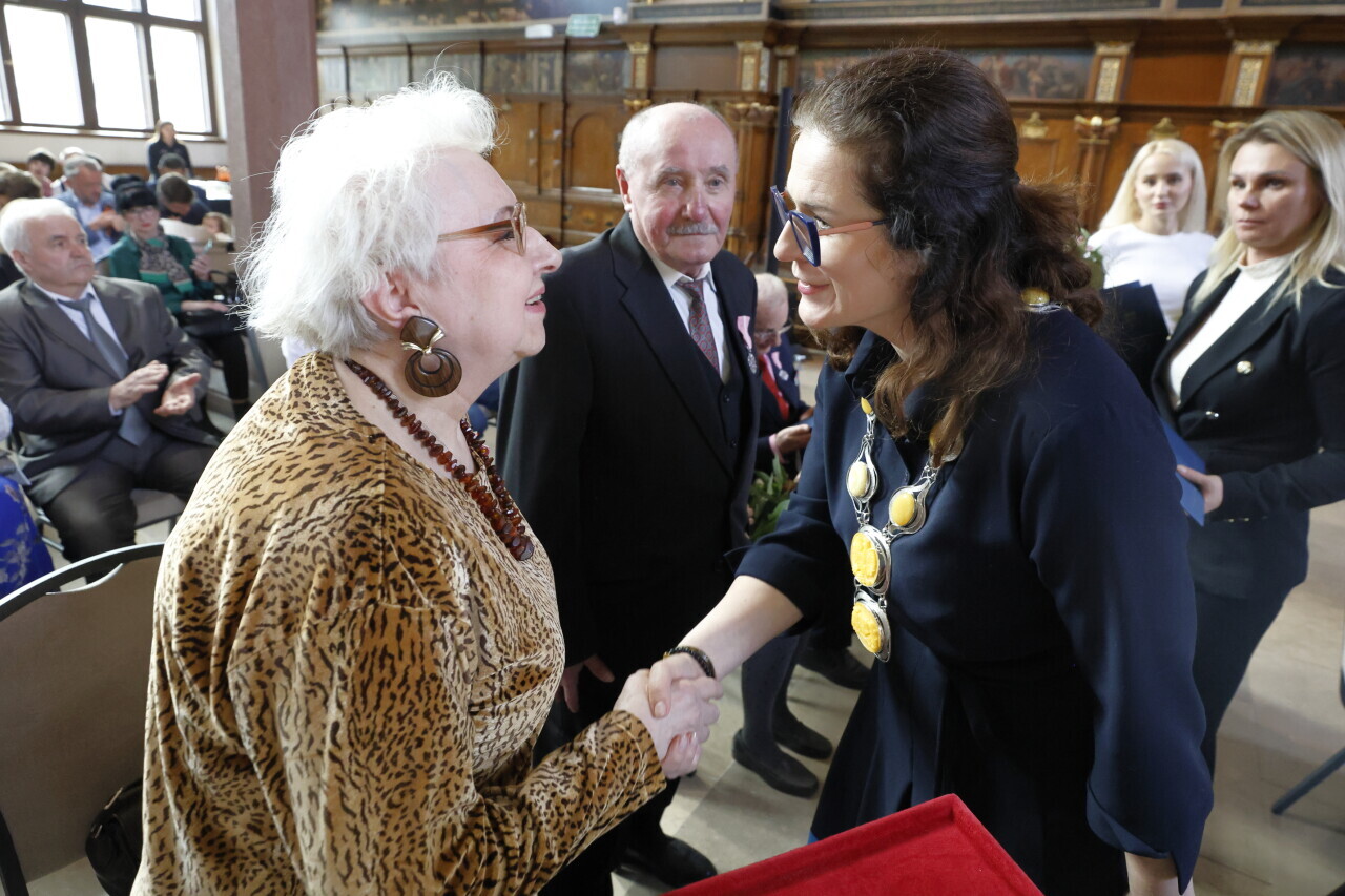 Gdańsk.Dwór Artusa. Jubileusz Par Małżeńskich - Złote Gody, podczas których Prezydent Gdańska Aleksandra Dulkiewicz wręczyła medale za długoletnie pożycie małżeńskie.
