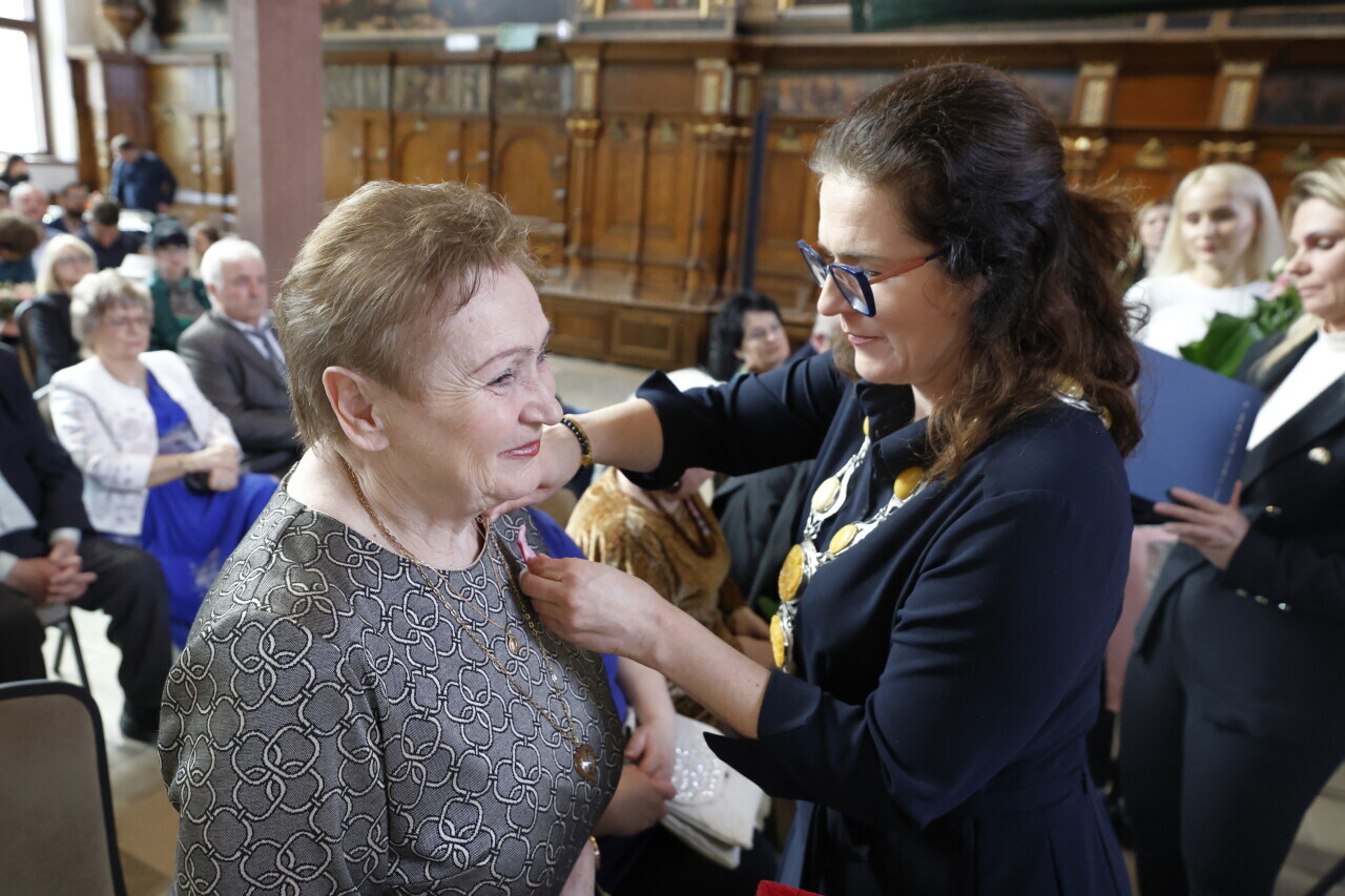 Gdańsk.Dwór Artusa. Jubileusz Par Małżeńskich - Złote Gody, podczas których Prezydent Gdańska Aleksandra Dulkiewicz wręczyła medale za długoletnie pożycie małżeńskie.