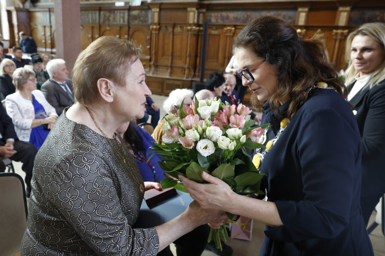Gdańsk.Dwór Artusa. Jubileusz Par Małżeńskich - Złote Gody, podczas których Prezydent Gdańska Aleksandra Dulkiewicz wręczyła medale za długoletnie pożycie małżeńskie.