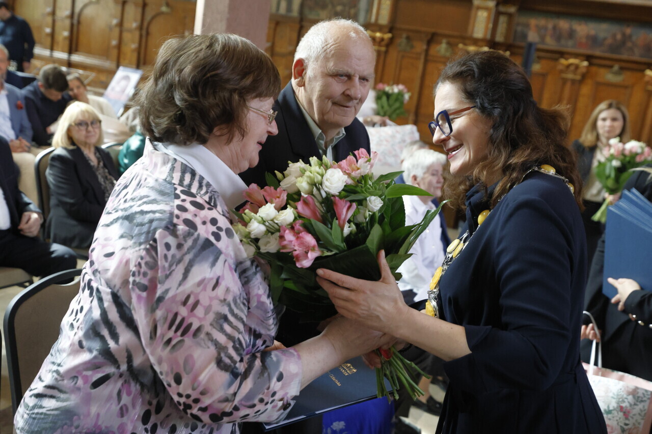 Gdańsk.Dwór Artusa. Jubileusz Par Małżeńskich - Złote Gody, podczas których Prezydent Gdańska Aleksandra Dulkiewicz wręczyła medale za długoletnie pożycie małżeńskie.