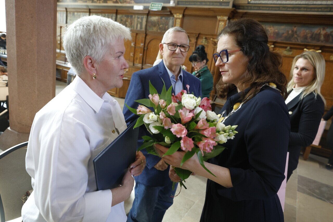 Gdańsk.Dwór Artusa. Jubileusz Par Małżeńskich - Złote Gody, podczas których Prezydent Gdańska Aleksandra Dulkiewicz wręczyła medale za długoletnie pożycie małżeńskie.