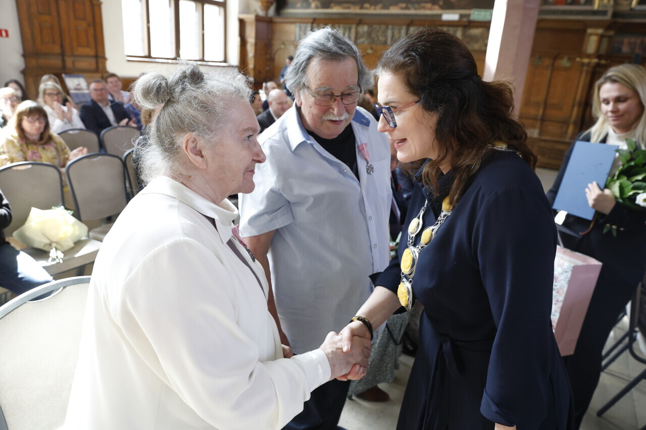 Gdańsk.Dwór Artusa. Jubileusz Par Małżeńskich - Złote Gody, podczas których Prezydent Gdańska Aleksandra Dulkiewicz wręczyła medale za długoletnie pożycie małżeńskie.