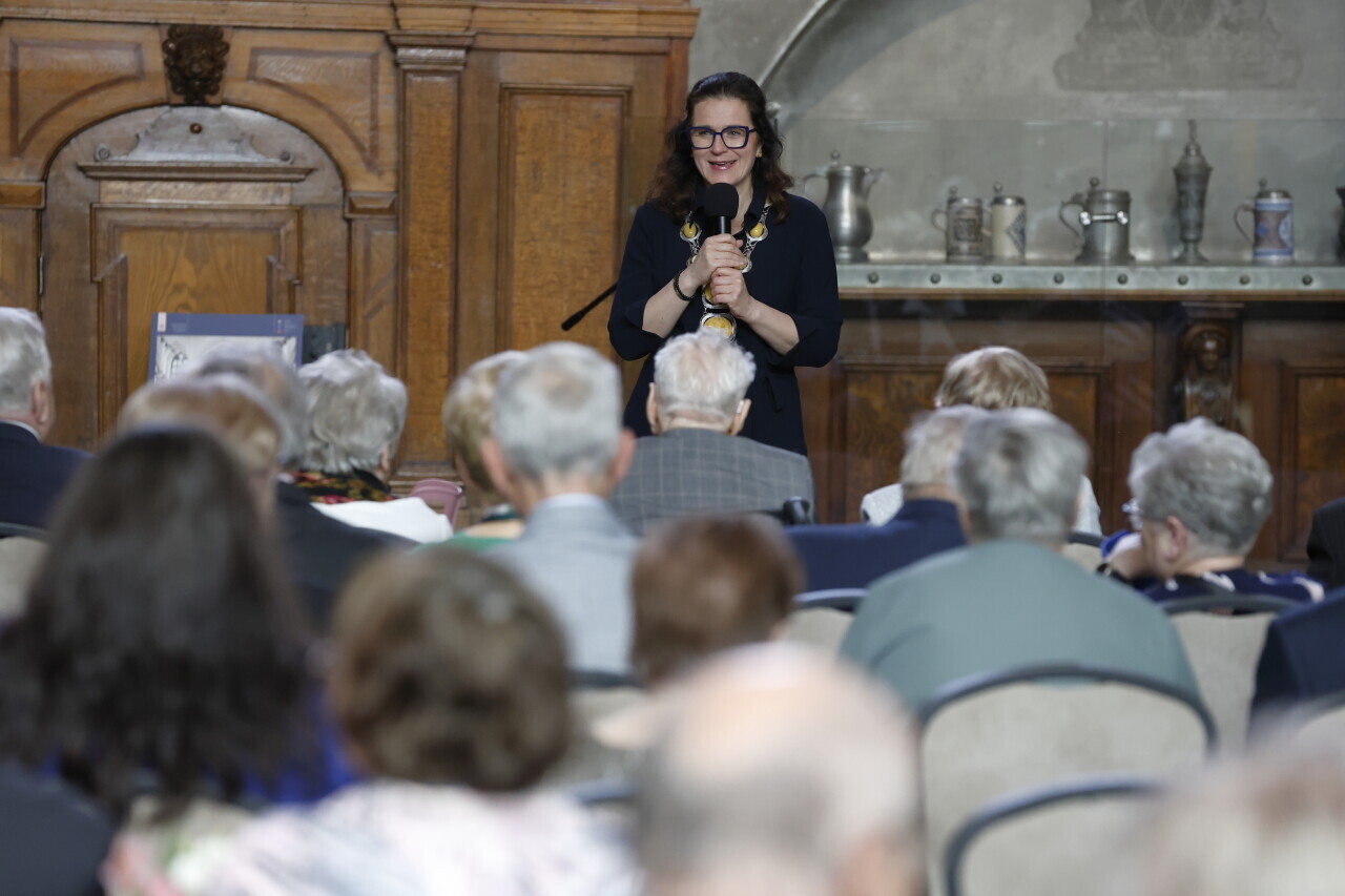 Gdańsk.Dwór Artusa. Jubileusz Par Małżeńskich - Złote Gody, podczas których Prezydent Gdańska Aleksandra Dulkiewicz wręczyła medale za długoletnie pożycie małżeńskie.