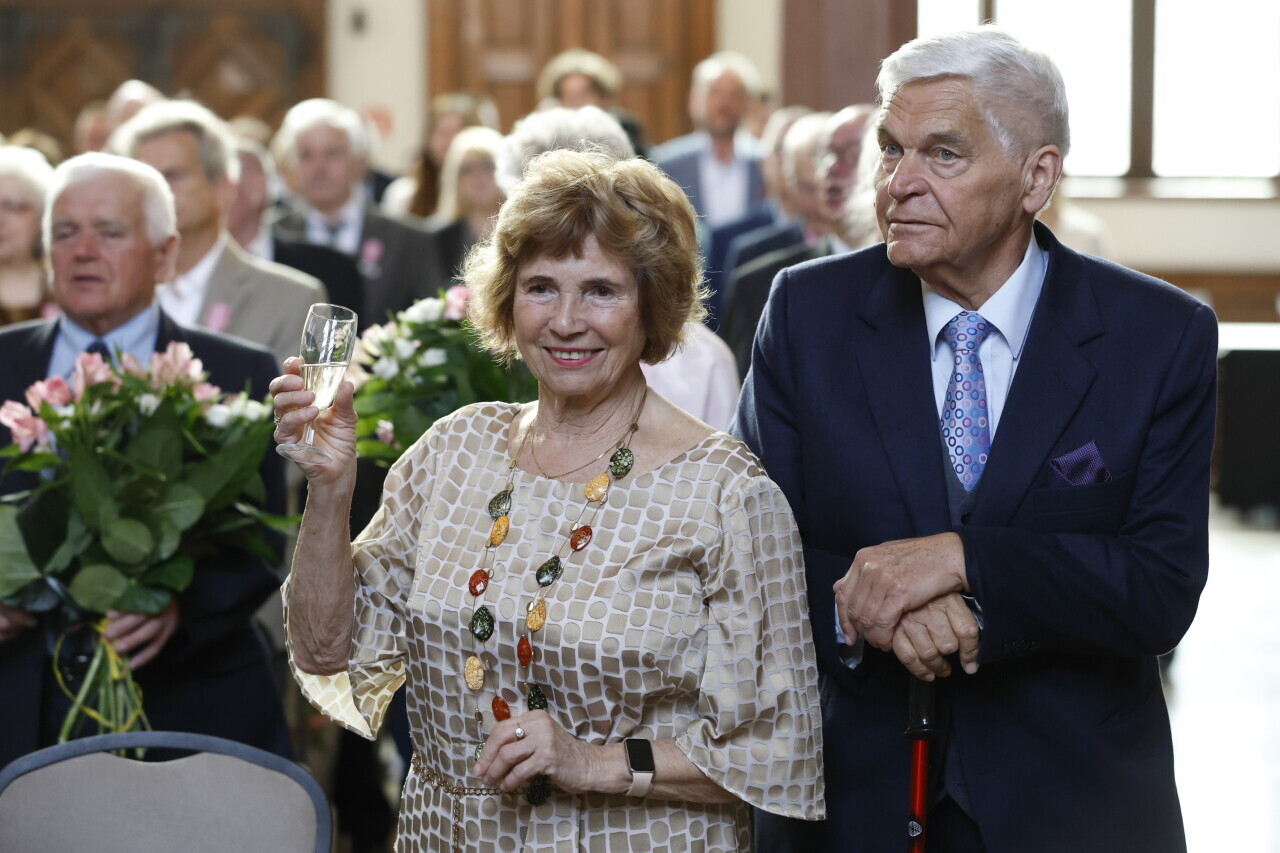 Gdańsk.Dwór Artusa. Jubileusz Par Małżeńskich - Złote Gody, podczas których Prezydent Gdańska Aleksandra Dulkiewicz wręczyła medale za długoletnie pożycie małżeńskie.