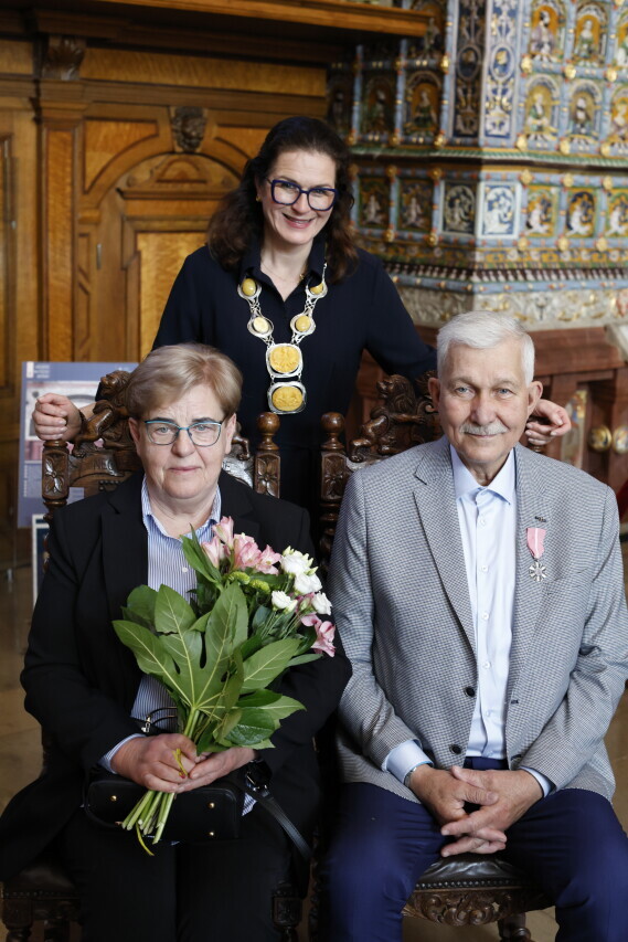 Gdańsk.Dwór Artusa. Jubileusz Par Małżeńskich - Złote Gody, podczas których Prezydent Gdańska Aleksandra Dulkiewicz wręczyła medale za długoletnie pożycie małżeńskie.