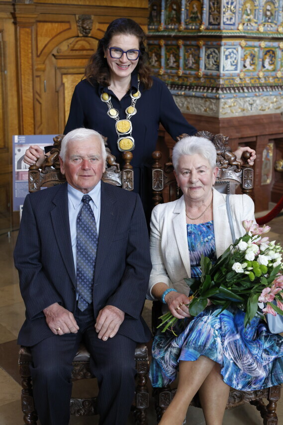 Gdańsk.Dwór Artusa. Jubileusz Par Małżeńskich - Złote Gody, podczas których Prezydent Gdańska Aleksandra Dulkiewicz wręczyła medale za długoletnie pożycie małżeńskie.