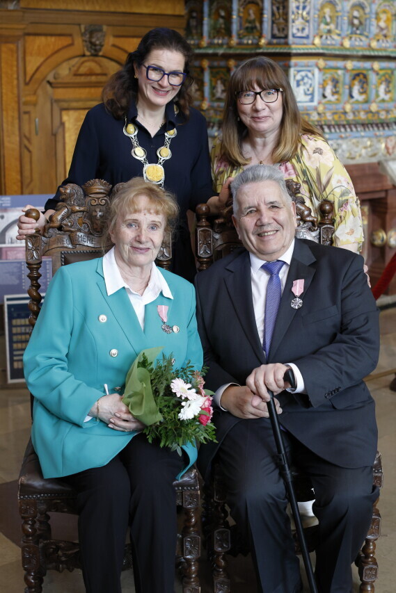 Gdańsk.Dwór Artusa. Jubileusz Par Małżeńskich - Złote Gody, podczas których Prezydent Gdańska Aleksandra Dulkiewicz wręczyła medale za długoletnie pożycie małżeńskie.
