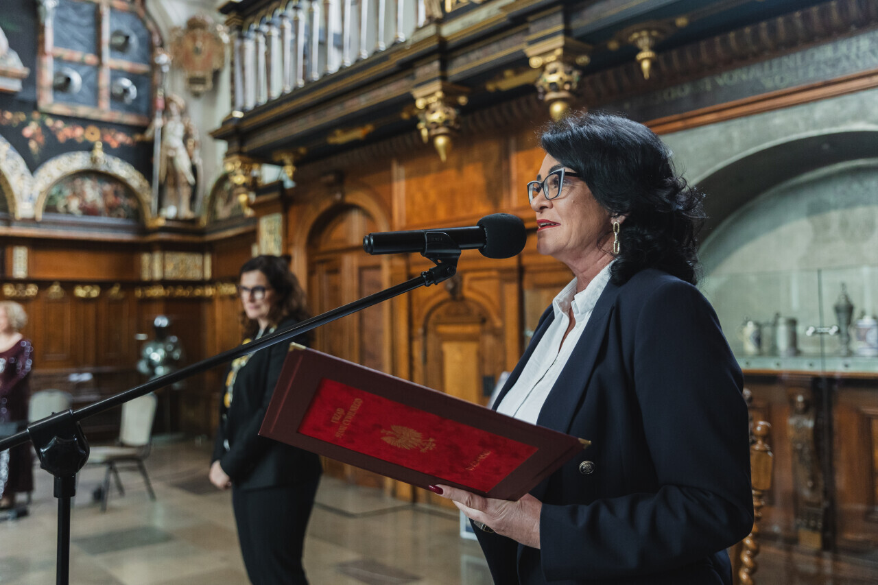 Gdańsk.Dwór Artusa. Jubileusz Par Małżeńskich - Złote Gody, podczas których Prezydent Gdańska Aleksandra Dulkiewicz wręczyła medale za długoletnie pożycie małżeńskie.