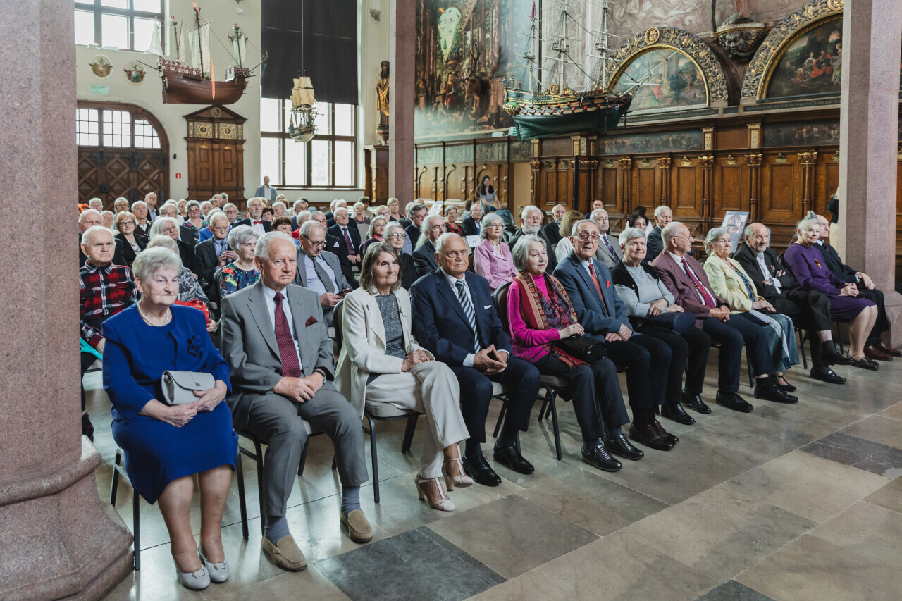 Gdańsk.Dwór Artusa. Jubileusz Par Małżeńskich - Złote Gody, podczas których Prezydent Gdańska Aleksandra Dulkiewicz wręczyła medale za długoletnie pożycie małżeńskie.