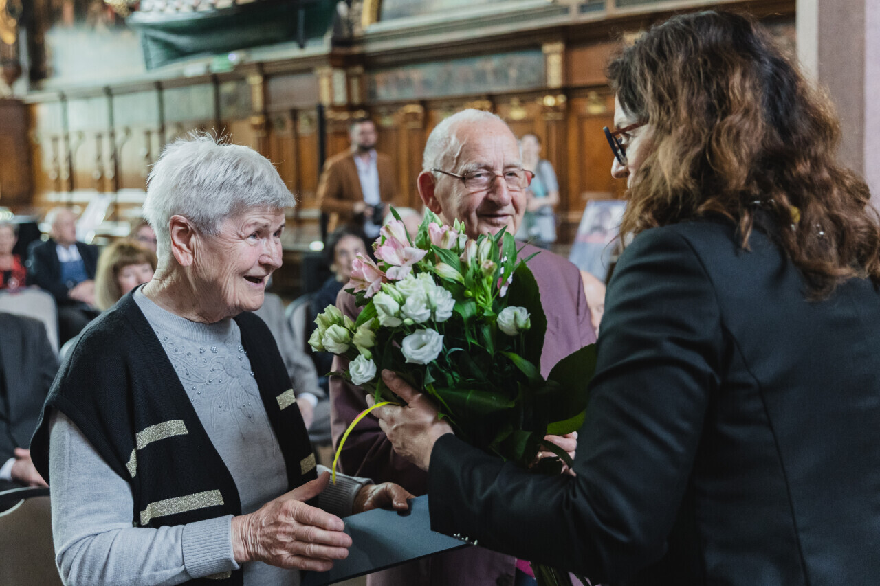 Gdańsk.Dwór Artusa. Jubileusz Par Małżeńskich - Złote Gody, podczas których Prezydent Gdańska Aleksandra Dulkiewicz wręczyła medale za długoletnie pożycie małżeńskie.