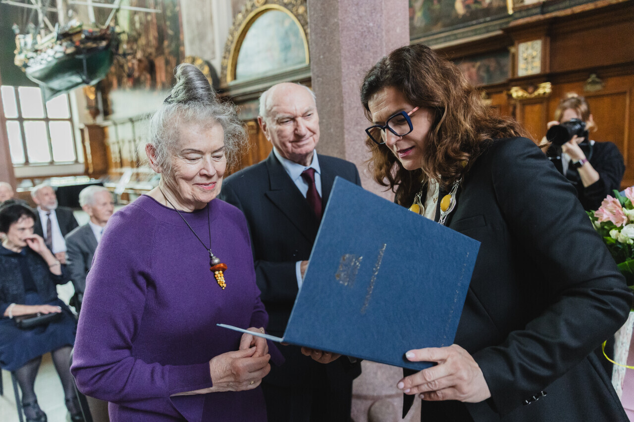 Gdańsk.Dwór Artusa. Jubileusz Par Małżeńskich - Złote Gody, podczas których Prezydent Gdańska Aleksandra Dulkiewicz wręczyła medale za długoletnie pożycie małżeńskie.