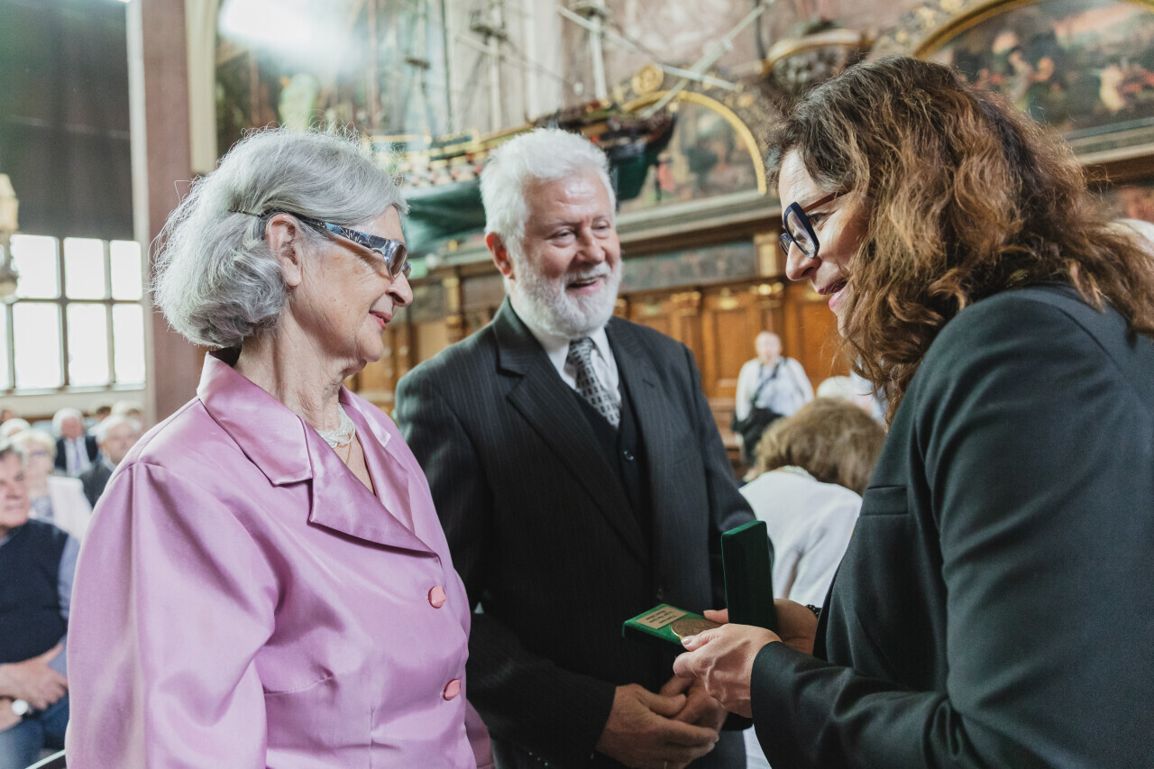 Gdańsk.Dwór Artusa. Jubileusz Par Małżeńskich - Złote Gody, podczas których Prezydent Gdańska Aleksandra Dulkiewicz wręczyła medale za długoletnie pożycie małżeńskie.